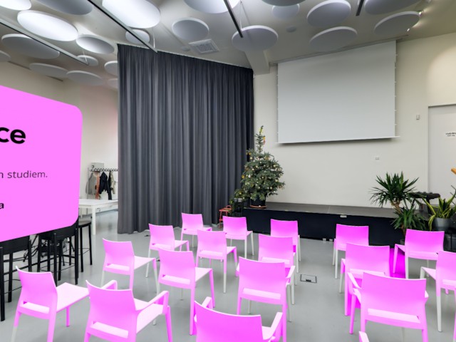 Vedle.space is a multifunctional event space for internal use (Visibility agency workshops) and rental use (event venue and recording studio for podcasts).